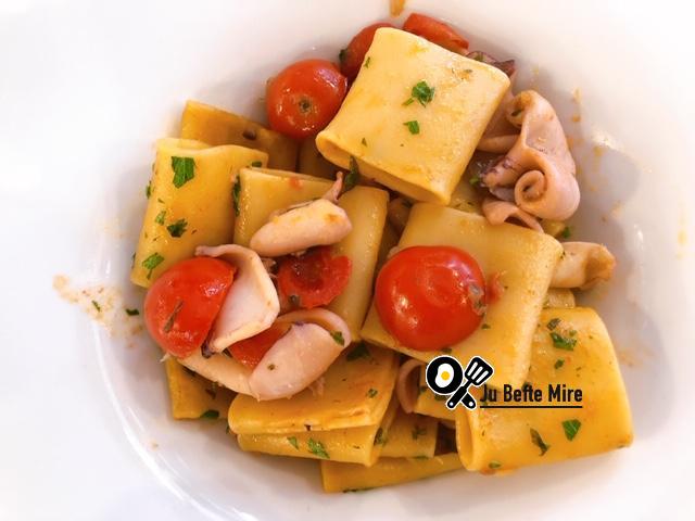Ne kete recete do te shohim si te pergatisim makarona me kallamar dhe domate te vogla (te njohura edhe me emrin domate qershi). Makaronat qe kam perdorur jane te tipit paccheri, ju mund te perdorni edhe ndonje lloj tjeter makaronash disa prej te cilave i gjeni ketu: disa tipe makaronash. Kjo pjate eshte teper e thjeshte per tu pergatitur dhe shume e shpjete.