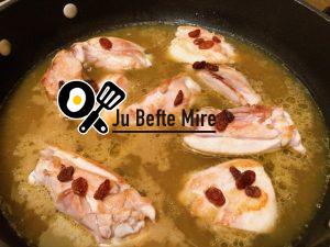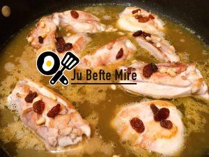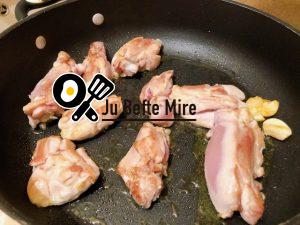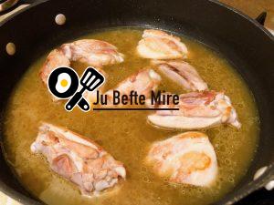 - Nderkohe qe vaji aromatizohet pastroni kofshet dhe krahet e pules nga lekura, i ndani ne racione dhe i shtoni tel tigani te skuqen. I ktheni copat e mishit nga te gjitha anet.